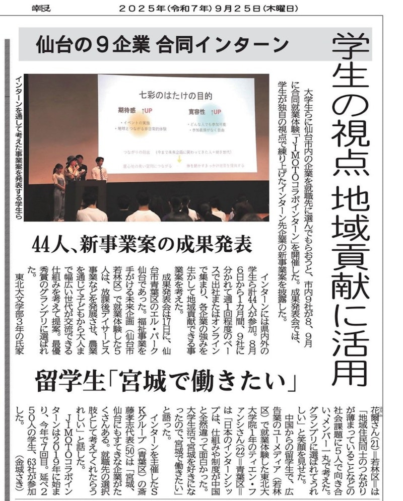 【メディア掲載】JIMOTOコラボインターン成果発表会の様子が河北新報に掲載されました(9/25)