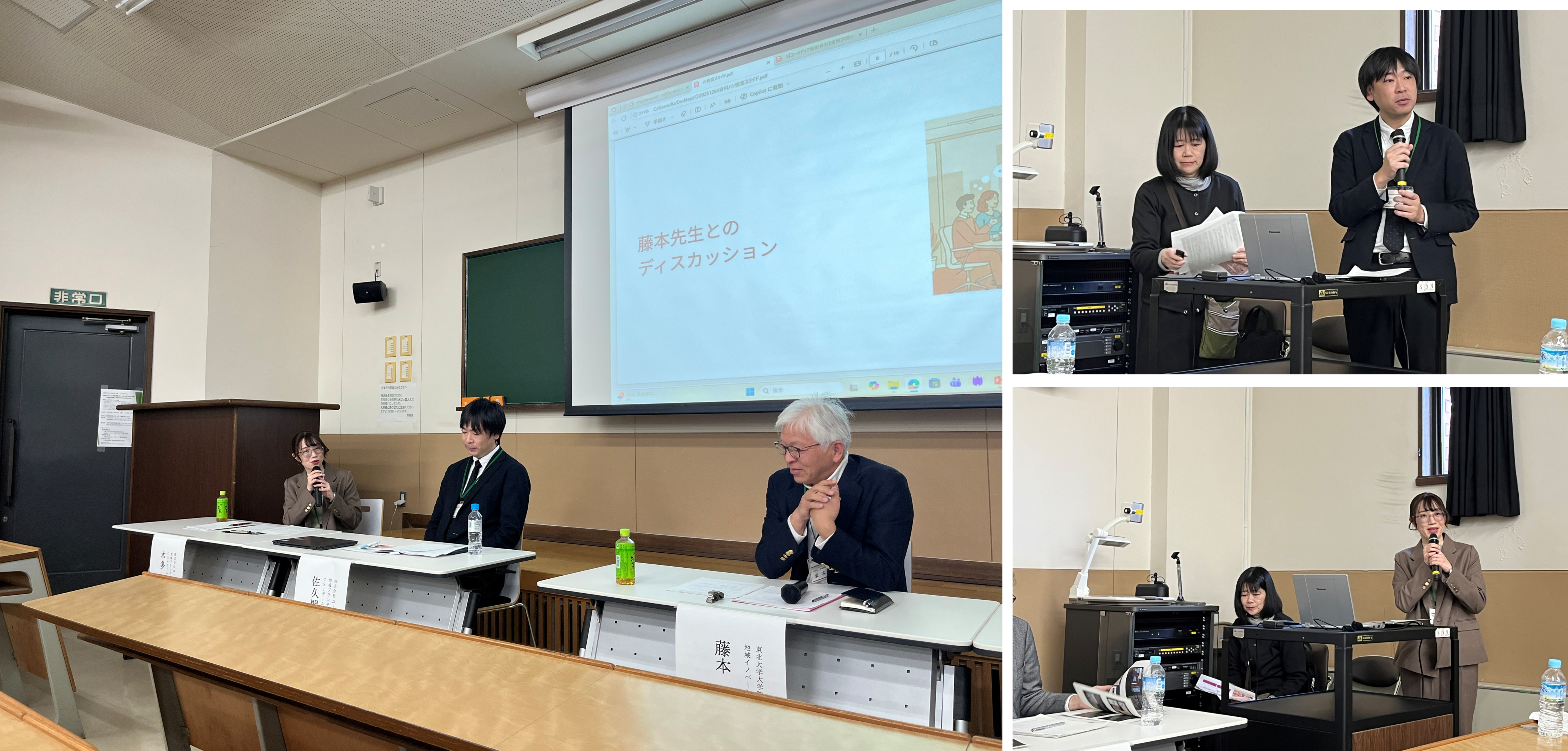 写真:左から時計回りに、社員2名と東北大学教授の藤本先生によるパネルディスカッション、ディスカッションに入る前に課長(右上)と若手社員(右下)それぞれから自身の経験エピソードをお話しさせていただきました。