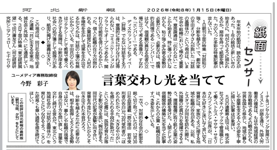 専務取締役 今野 彩子が河北新報の『紙面センサー』欄に執筆しました(1/15 朝刊掲載)
