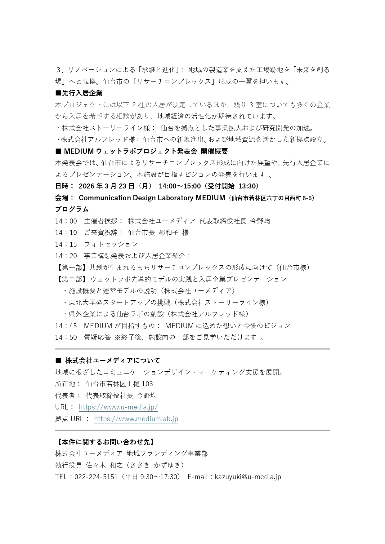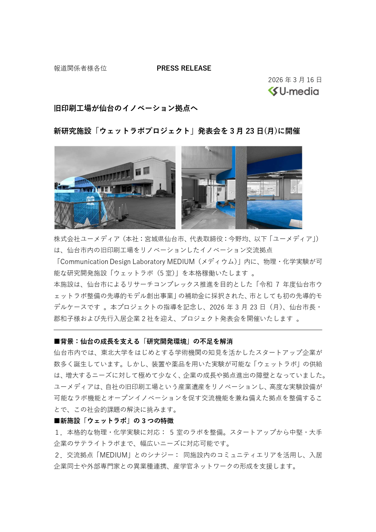 【プレスリリース】旧印刷工場が仙台のイノベーション拠点へ 新研究施設「ウェットラボプロジェクト」発表会を3月23日(月)に開催 2026.03.16 Tweet 画像をクリックしますと、ダウンロードが可能となります。※PDFファイルが開きます。 Tweet