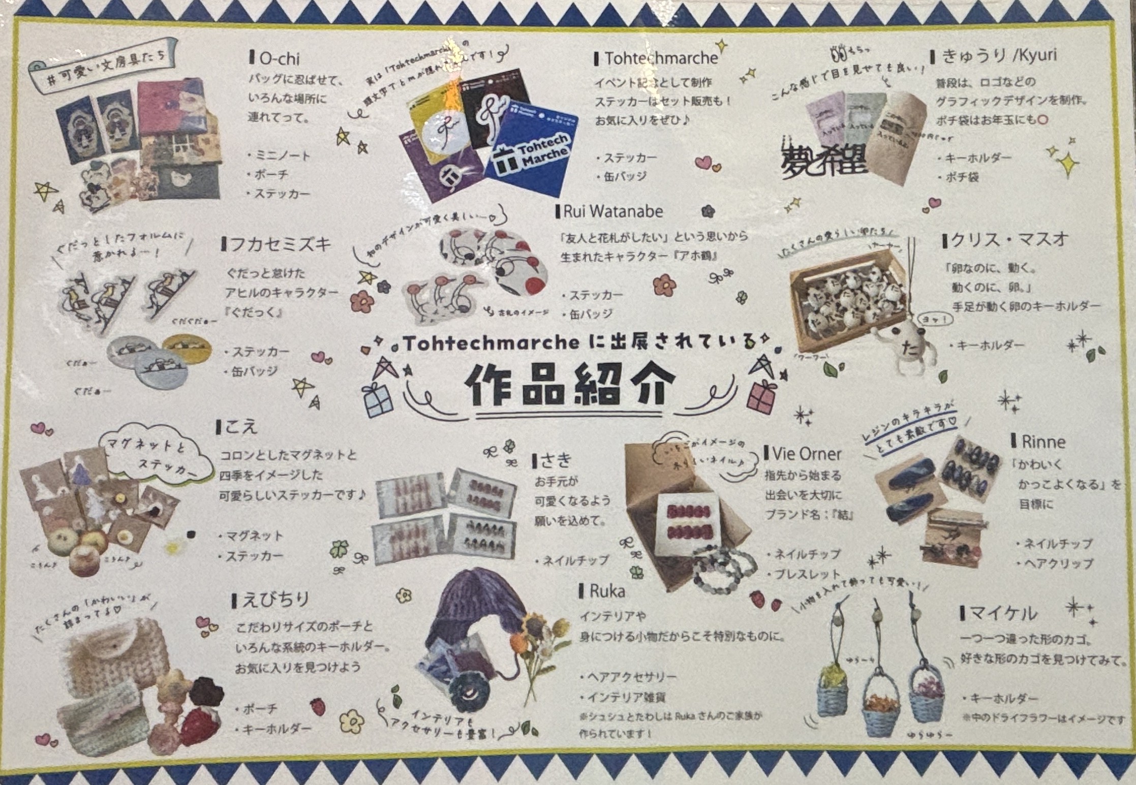 ハンドメイド作品を出品した学生作家とハンドメイドが好きなお客様を繋ぐ「結び目」として、学生が人と人の接点を作り、東北工業大学のデザイン学科を知ってもらいたい、商店街をさらに盛り上げていきたいという想いで学生が企画しました。
