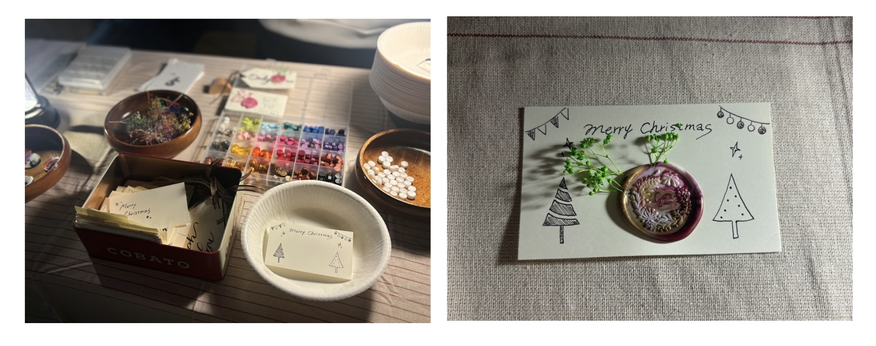 写真:左側 シーリングスタンプ作成前の準備の様子(好きな色のロウ4種類と、1種類のドライフラワー、ベースとなるカードを選択する) 右側 完成したオリジナルカード