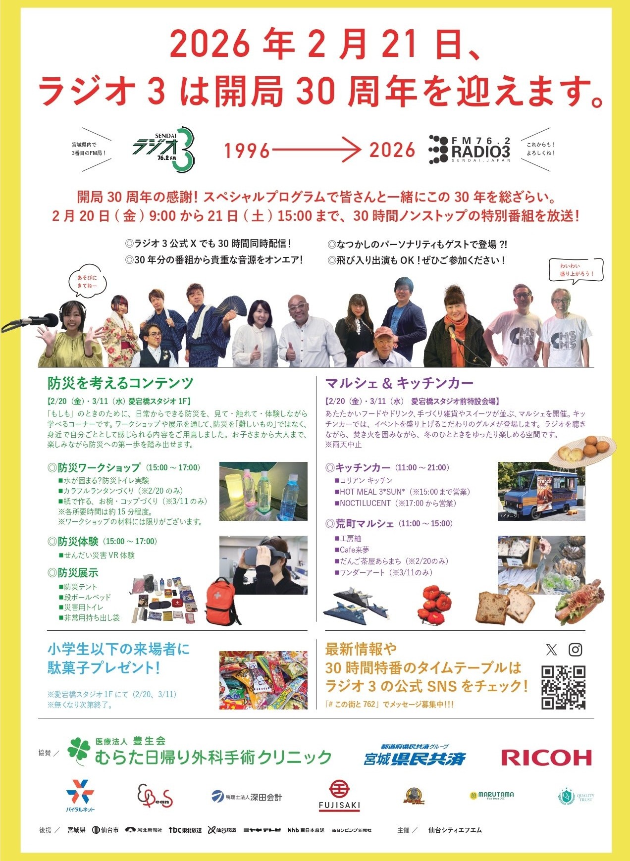 ユーメディアグループのメディアのひとつ、仙台のコミュニティFM ラジオ3 が、2026年2月21日に開局30周年を迎えます。