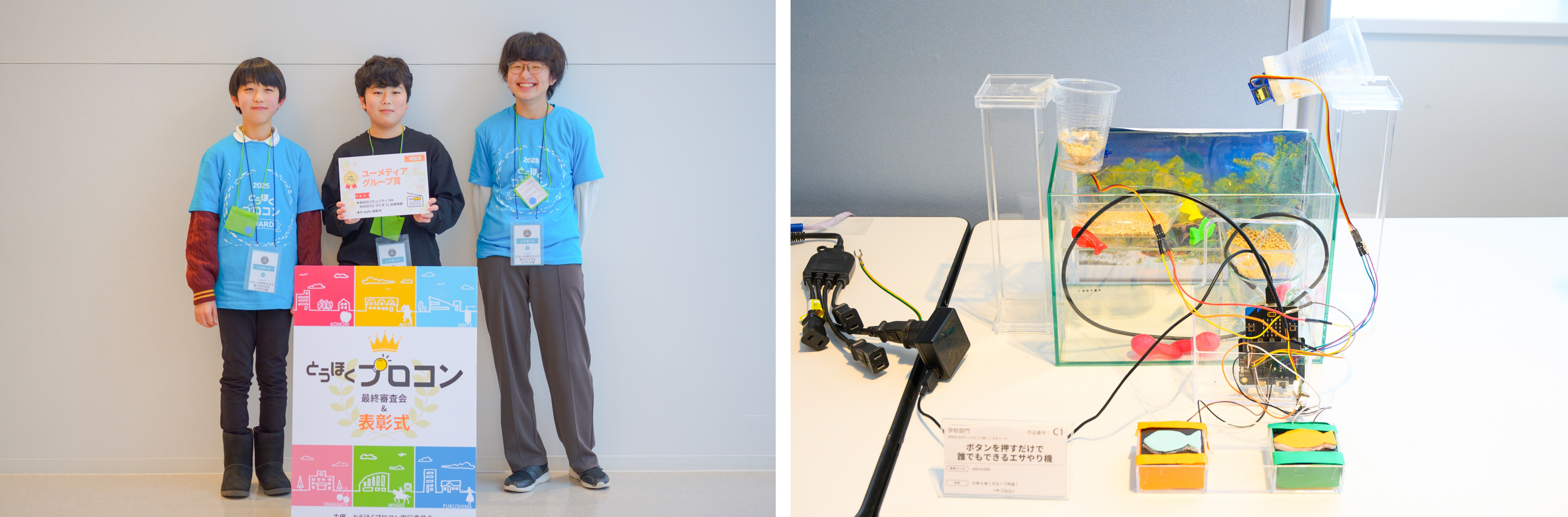 ▼ユーメディアグループ賞「ボタンを押すだけで誰でもできるエサやり機」を開発した小学6年生の3名